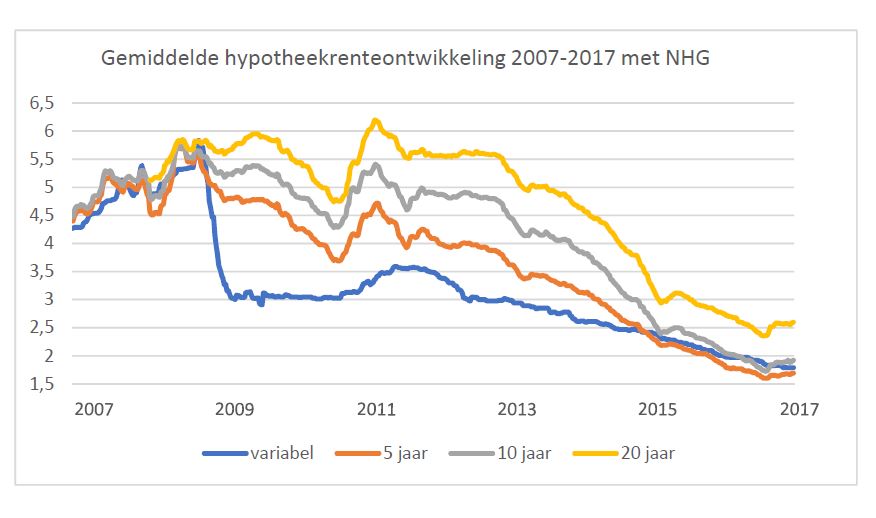 Grafiek met de ontwikkeling van de gemiddelde 5 jaar vaste hypotheekrente met .